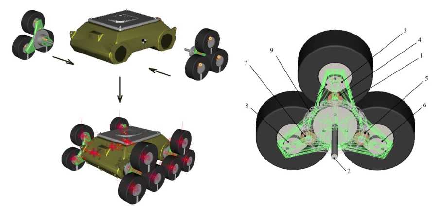 Ключевой конструктивной особенностью исследуемого робота является использование трехкатковых псевдошагающих движителей. Оси катков жестко соединены с шестернями, обозначенными на рис. 2 цифрами 3, 6, 8, которые соединены через промежуточные шестерни 4, 5, 7 с ведущей шестерней и ее валом 2. Треугольное водило, на котором закреплены эти шестерни, обозначено цифрой 1, опорой является ступица 9. Движитель работает следующим образом: момент подводиться к ведущей шестерне 2; через промежуточные шестерни 4, 5, 7 момент передается на шестерни 3, 6, 8, тем самым приводя во вращение катки. При движении по ровному, твердому основанию момент передается только на те катки, которые находятся в контакте с опорной поверхностью. В случае преодоления препятствий, высота которых больше диаметра катка, движение БНТС происходит за счет реализации продольных реакций при взаимодействии катка с опорной поверхностью при вращении треугольного водила, которое, в свою очередь, приводится в движение моментом, подводимым к ступице 9 [6].