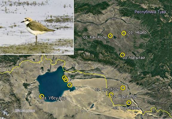 Рисунок 1 – Места встреч морского зуйка Charadrius alexandrinus в Улуг-Хемской и Убсу-Нурской котловинах (Россия, Монголия)