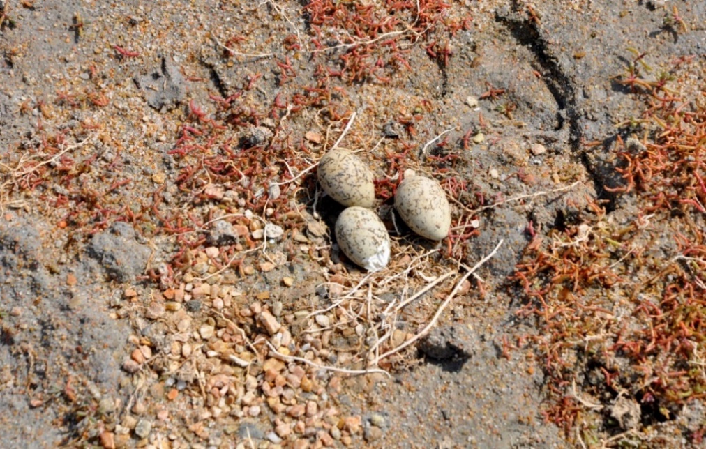 Из найденных гнезд шесть располагались на песке, три – на твердой засоленной грязевой поверхности. Из последних кладка № 7 изначально, вероятно, была отложена на плотной плоской площадке, выложенной мелкими камешками, но при обнаружении три яйца лежали в расположенном рядом отпечатке копыта коровы, одно было повреждено – отсутствовал фрагмент скорлупы на остром конце. Вероятно, яйца выкатились из гнезда, задетые проходящим скотом, однако взрослые птицы продолжали их насиживать, при осмотре беспокоились рядом, эмбрионы были живы, в том числе в поврежденном яйце (наблюдалось шевеление). Эта кладка отличалась очень светлой окраской рисунка из пятен – до светло-коричневого (рис. 2) и более овальной формой яиц (индекс формы по формуле А.Л. Романова [27] – 69,12%.