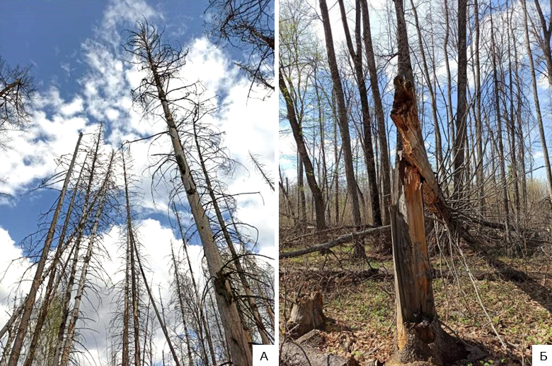 Рисунок 1 – Современное состояние ельника в памятнике природы «Калиновский ельник»: А – категория древостоя «старый сухостой»; Б – категория древостоя «старый бурелом»
