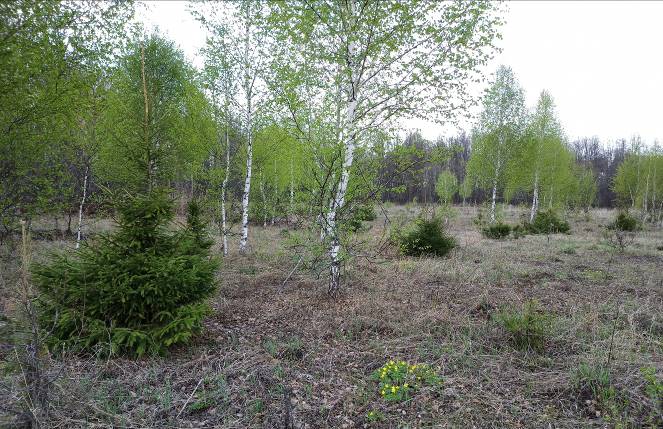 На территории, когда-то занятой еловыми посадками, в настоящее время местами поваленные стволы ели, местами они ещё стоят, развит кустарниковый ярус из Lonicera xylosteum L., Padus avium Mill., местами встречаются отдельно стоящие генеративные представители лиственных пород – Acer platanoides L. и Tilia cordata Mill.