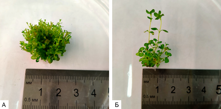 Выявлено, что семена зверобоя продырявленного при введении в культуру in vitro обладают высокой всхожестью (82%). На пятые сутки наблюдали массовое прорастание семян, на седьмые – развернутые семядоли, на 12-е сутки – хорошо развитый проросток с одной парой округлых листьев. На среде MS с БАП 1,0 + ИУК 0,1 мг/л в начале образовался светлозеленый каллус, а затем появились многочисленные мелкие побеги (рис. 1: A). На среде с БАП 0,1 + ИУК 1,0 мг/л на гипокотиле наблюдалась прямая регенерация побегов (рис. 1: Б).