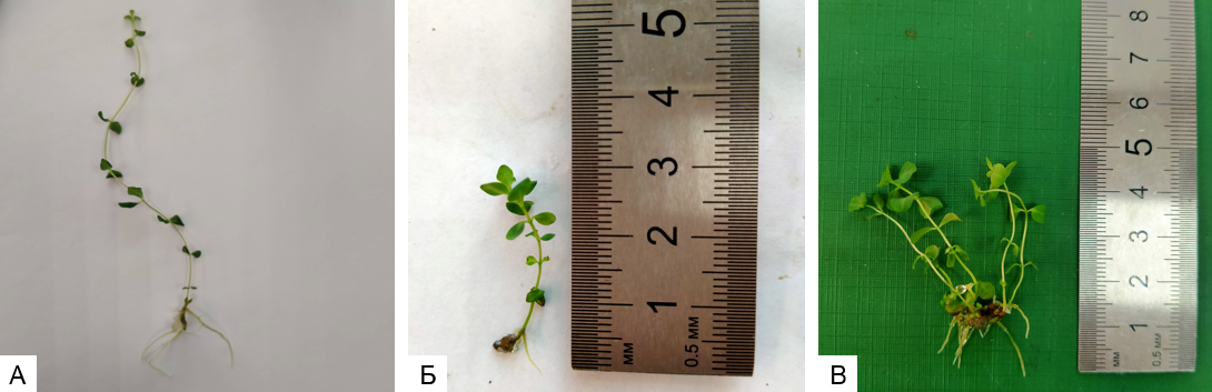 Рисунок 2 – Ризогенез зверобоя продырявленного. А – MS + ИУК 1,0 мг/л; Б – MS без гормонов; В – MS + ИМК 1,0 мг/л