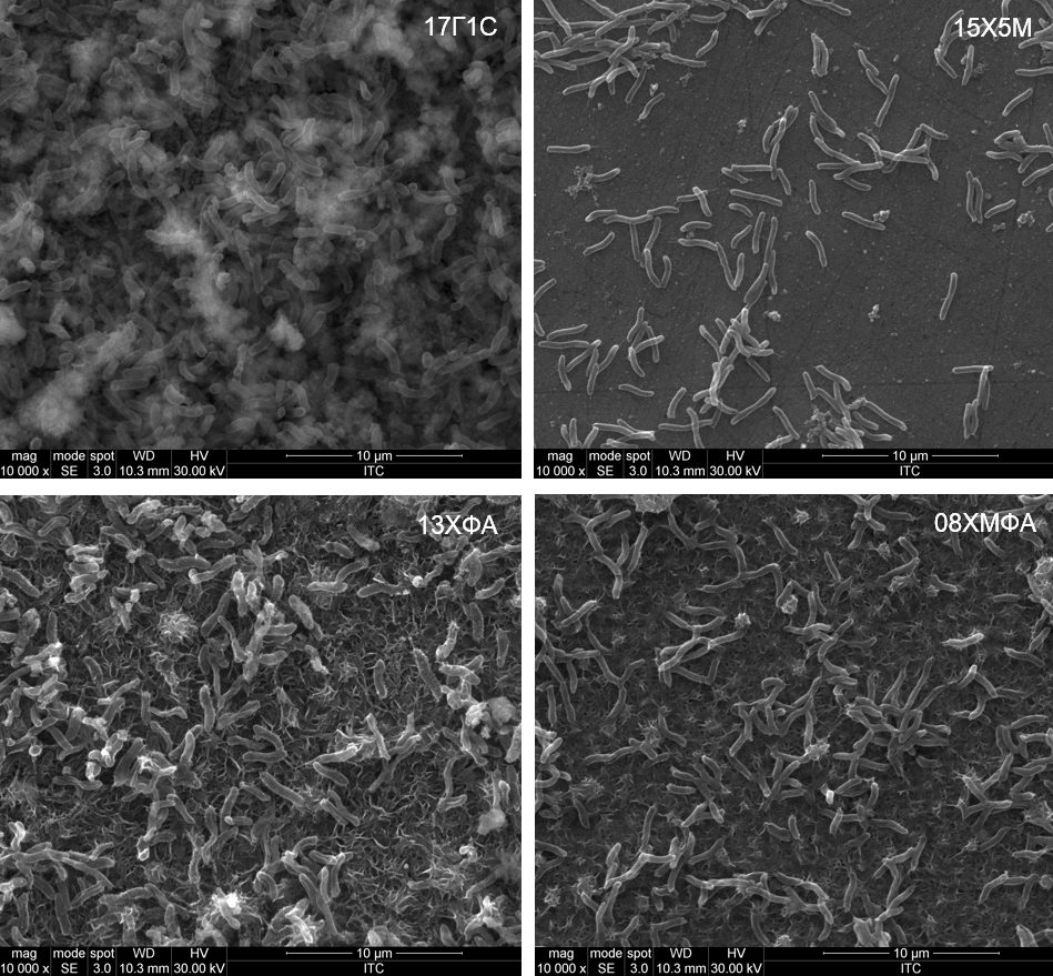 Поскольку образцы стали 13ХФА и 08ХМФА были покрыты сплошной биопленкой так же, как и образец сравнения, можно сделать вывод, что легирующие элементы Cr-V и Cr-Mo-V в количестве, указанном в табл. 1, не оказали влияние на прикрепление и размножение СВБ. Увеличенное содержания хрома в стали 15Х5М препятствовало размножению бактерий и образованию сплошной биопленки СВБ на ее поверхности.