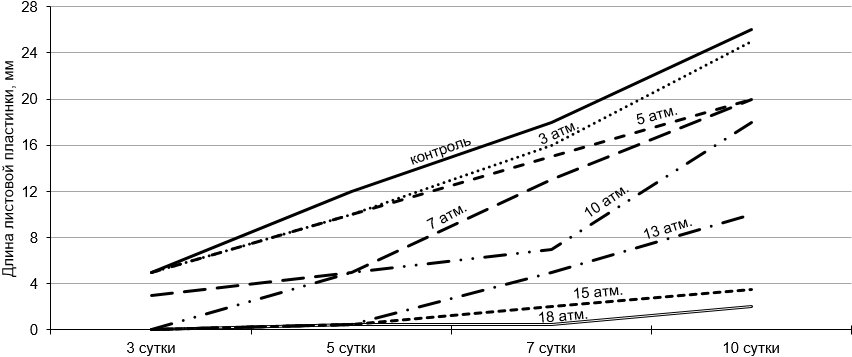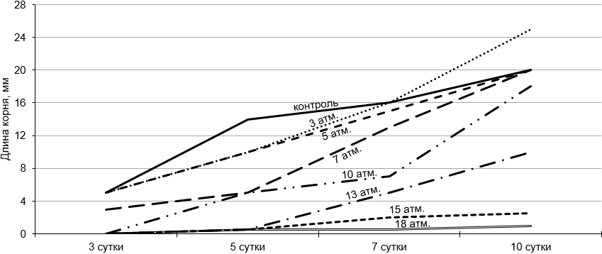 В ходе проведения эксперимента изучено прорастание семян M. virgata в условиях осмотического стресса, результаты представлены на рис. 1. Наибольшее значение всхожести семян отмечено в условиях контроля и при небольшом уровне осмотического стресса (3, 5 и 7 атм.), всхожесть 95–97%. Присутствие в среде осмотика замедляет скорость прорастания. Так, если в контроле и при 3 атм. всхожесть достигла своего максимума уже на третьи сутки, то при 5 атм. и 7 атм. – на седьмые сутки. Дальнейшее увеличение осмотического давления привело к снижению как скорости прорастания, так и проценту всхожести. Если при 10 и 13 атм. семена к концу проведения опыта имели средние показатели всхожести (80 и 70% соответственно), то при 15 и 18 атм. – только 30 и 10%. Осмотический стресс влияет на рост вегетативных органов, поэтому в ходе эксперимента определяли морфометрические показатели проростков (рис. 2 и 3). Значительное угнетение ростовых процессов отмечено при осмотическом давлении в 13, 15 и 18 атм. Высокая концентрация осмотика практически полностью останавливает ростовые процессы. На десятые сутки при 18 атм. средняя длина листовой пластинки и корня составила 2 и 1 мм соответственно.