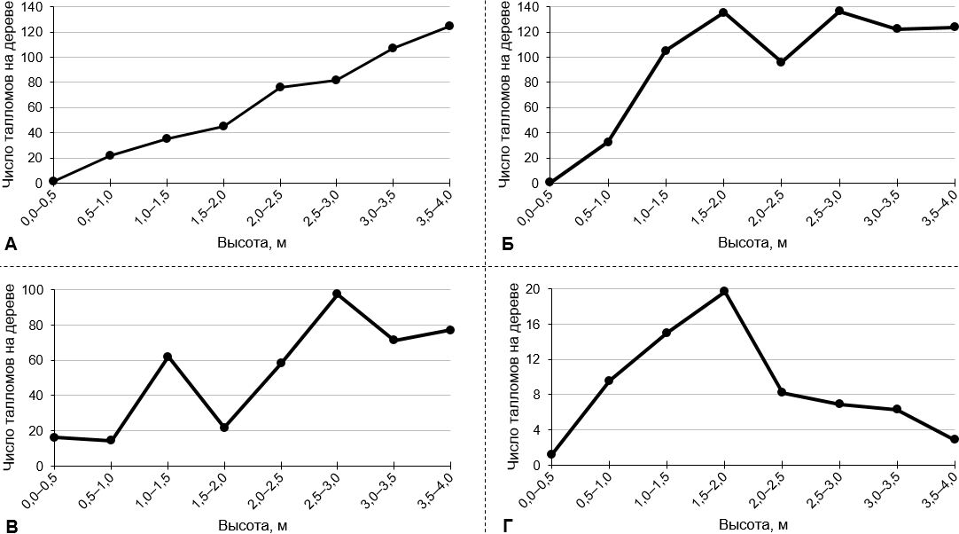 Можно выделить разные типы распределения числа талломов E. prunastri по высотам (хи-квадрат, P < 0,001). Для большинства м/о отмечено увеличение числа талломов с возрастанием высоты ствола. В пойменных м/о 1, 2, 3, 6 и в антропогенно измененном м/о 8 происходит постепенное увеличение числа талломов E. prunastri от основания ствола до 4 м (рис. 1: А). В м/о 4, 5 число талломов увеличивается до высоты 1–1,5 м, в м/о 2 – до высоты 2–2,5 м, далее их число не изменяется до высоты 4 м (рис. 1: Б). На просеке вдоль ЛЭП, м/о 9 (рис. 1: В) отмечается два максимума по числу талломов на высотах 1–1,5 и 2,5–3 м. По сравнению с природными м/о в антропогенно нарушенном городском м/о 7 (рис. 1: Г) можно видеть постепенное увеличение числа талломов E. prunastri до высоты 2 м с последующим резким уменьшением числа талломов на высотах 2,5–4 м.