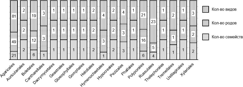 Большинство выявленных видов относится к порядку Agaricales (81 вид; 47,4%). Данный порядок представлен 21 семейством (36,2% от общего числа семейств) и 49 родами (46,2% от общего числа родов). Порядок Russulales представлен 23 видами (13,5%) с 4 семействами (6,9%) и 5 родами (4,7%), Polyporales (21; 12,3%), включающий 6 семейств (10,3%) и 16 родами (15,1%), Boletales (19; 11,1%) в виде 6 семейств (10,3%) и 12 родов (11,3%), Hymenochaetales и Pezizales (4; 2,3%), представленные 1 (1,7%), 3 (5,2%) семействами и 3 родами (2,8%), Cantharellales, Xylariales (3; 1,8%), состоящие из 1 (1,7%), 2 (3,4%) семейств, 3 (2,8%), 2 (1,9%) родов, Auriculariales, Helotiales, Hypocreales, Tremellales (2; 1,2%), представленные 2 (3,4%), 1 (1,7%) семействами, 2 (1,9%), 1 (0,9%) родами. Порядки Dacrymecetales, Geastrales, Gloeophyllales, Gomphales, Phallales, Thelephorales, Ustilaginales состоят из 1 семейства (1,7%), 1 рода (0,9%) и 1 вида (0,6%) (рис. 1).