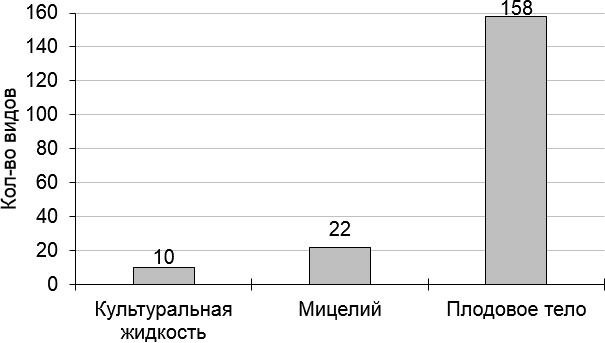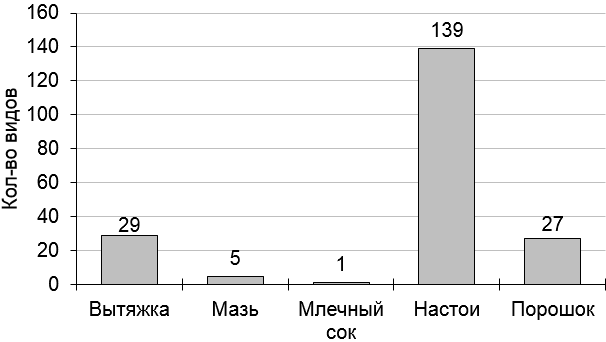 Чаще всего в качестве источника выделения полезных веществ выступают плодовые тела (158 видов грибов; 92,4%), в меньшей степени используются мицелий (22; 12,9%) и культуральная жидкость (10; 5,8%) (рис. 2). В фармакологическом плане обычно используются настои (139; 81,3%) и вытяжка (29; 17,0%), полученные из плодовых тел лекарственных грибов, реже – порошок (27; 15,8%), мази (5; 2,9%) и млечный сок (1; 0,6%) (рис. 3).