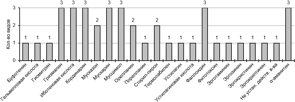 Как видно из рис. 4, подавляющее число таксонов ядовитых лекарственных грибов в плодовых телах содержат α-аманитин, гризмалин, иботеновая кислота, кординарин, мускарин, мусцимол, фаллоидин (3; 18,8%), мусказон, орелланин, стирил-пирон (2; 12,5%), буфотенин, гельвелловая кислота, гиомитрин, порелланин, термолабилен, устилагин, устилагиновая кислота, фитотоксин, эрготаминин, эргозинин, эргокристинин, эргокриптинин (1; 6,3%). У Agaricus xanthodermus в плодовом теле содержатся неустановленные действующие вещества (6,3%).