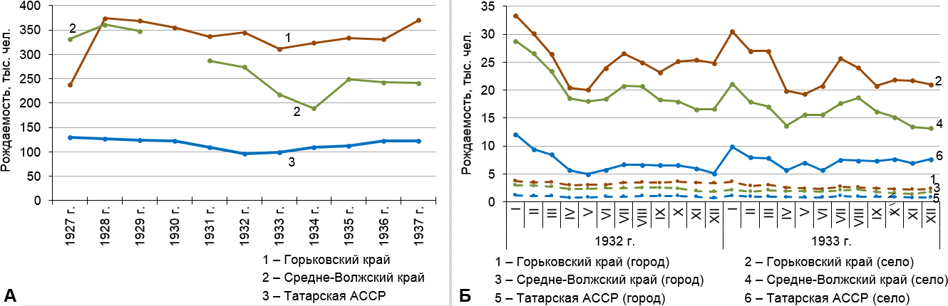 Динамические ряды рождаемости указывают на принципиально разные демографические процессы в Волго-Вятском регионе, Татарской АССР и Средне-Волжском крае. В Средне-Волжском крае рождаемость падала резко, четко выделяется «яма» рождаемости, а самая низкая рождаемость зафиксирована в 1934 году. Тренд падения рождаемости в Горьковском крае плавный и почти линейный, темпы падения рождаемости до 1933 года гораздо ниже без значительной «ямы» 1933 года. В Татарской АССР наблюдается только локальное небольшое снижение рождаемости в 1931–1933 годах. Самая низкая рождаемость в Татарстане отмечена в 1932 году, а в Горьковском крае – в 1933 году. Во всех регионах в период 1932–1933 годов наблюдаются четко выраженные сезонные «пики» и «ямы» рождаемости, характерные для сельского населения при хозяйстве неиндустриального типа. Сезонность этих колебаний с привязкой к сельскохозяйственному году подтверждается их смещением на месяц в северных регионах. В городах падение рождаемости было с февраля 1933 года с небольшими «пиками» рождаемости, как на селе.