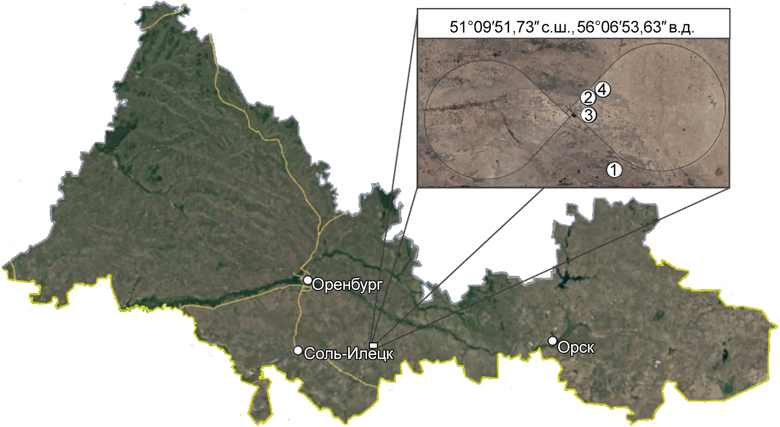 Сбор материала для исследования производился на территории заповедника Оренбургский (участок «Предуральская степь») на протяжении теплого сезона в три этапа: 1) II декада мая; 2) I декада августа; 3) I декада сентября. Отбор материала был произведен на трех участках внутри акклиматизационного загона для лошадей Пржевальского, в котором с 2017 г. содержатся 6 особей, и на участке, расположенном вне загона (условно принятом за целину) (рис. 1).