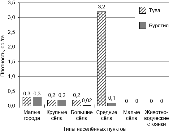 На рис. 1 показано распределение черной вороны по разным типам населенным пунктам степных ландшафтов Тувы и Бурятии. Как видно, в животноводческих и малых сельских населенных пунктах гнездование ворон не зарегистрировано. Во-первых, в них обычно не бывает деревьев для устройства гнезд, во-вторых, в маленьких селах вороны становятся пугливыми и избегают близости человека. Скорее всего, второй фактор является основным. Другие типы населенных пунктов – от средних сел до малых городов – практически одинаково привлекают черных ворон для гнездования. Все зависит от конкретных условий, от степени озелененности, кормовых стаций, заметное влияние также оказывает наличие реки или других водоемов. Например, в селах Бай-Тал, Суг-Аксы, Балгазын и др. (Тувинская котловина) из группы больших сельских населенных пунктов Тувы условия оказались более благоприятными, чем в таких же селах Бурятии (Оронгой, Удинское). То же касается средних сел Тувы (Аксы-Барлык, Аржаан) и Бурятии (Белоозерск, Боргой, Инзагатуй). Поэтому плотность гнездящихся пар в селах Тувы выше, чем Бурятии.