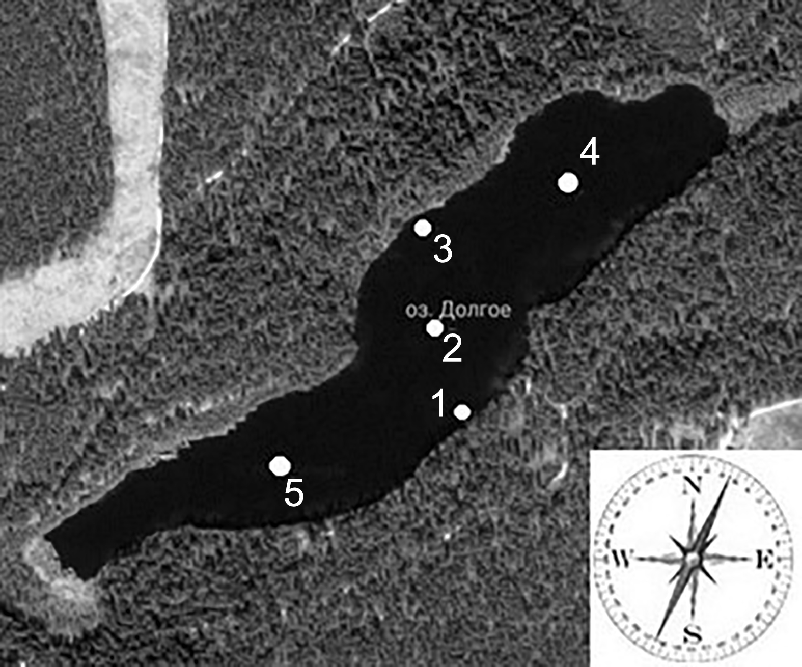 Отбор гидробиологического материала проводился в летний период (июль) 2017–2020 гг. на пяти равномерно расположенных по акватории озера станциях (рис. 1).