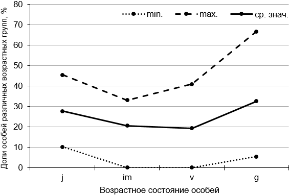 Усредненный возрастной спектр ЦП O. mascula в ГЗ «Шульган-Таш» полночленный, двувершинный, с максимумами особей генеративного и ювенильного возрастных групп (рис. 2). Зона базового спектра широкая в ювенильной возрастной группе, а в генеративном, виргинильном и имматурном возрастных состояниях – узкая. Таким образом, ювенильные особи подвержены наибольшим колебаниям численности в ЦП.