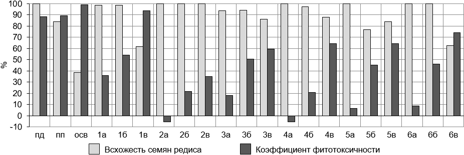 Согласно полученным данным, отдельные компоненты субстратов – пивная дробина, птичий помет и осадки сточных вод – токсичны в отношении проростков редиса, имеют самые высокие значения фитотоксичности: 88, 89 и 99% соответственно; осадки сточных вод также снижают всхожесть семян редиса на 62% (рис. 1).