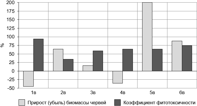 Субстраты варианта «в» – с червями и «Тамиром» – по результатам исследований имеют самую высокую фитотоксическую активность (рис. 1). Относительно биомассы червей в субстратах № 1(в) и № 4(в) отмечена убыль массы червей на 45% и 35,5% соответственно (рис. 3), в остальных субстратах отмечен прирост биомассы: в субстрате № 3(в) зафиксирован самый низкий прирост биомассы 15,7%, в субстрате № 2(в) биомасса червей увеличилась на 64,2%, в субстрате № 6(в) на 88%, а в субстрате № 5(в) отмечено самое высокое значение прироста биомассы червей – на 200% (рис. 3). Самый фитотоксичный субстрат № 1(в) токсичен и для червей – зафиксирована самая высокая убыль биомассы червей. Субстраты № 2, № 3, № 5 и № 6 варианта «в» в отношении червей не токсичны (рис. 3).