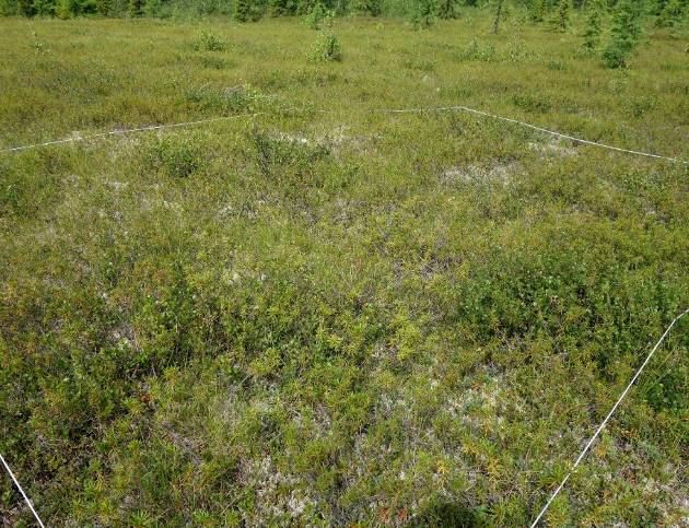 - Ерниковая кустарничково-мохово-лишайниковая бугорковатая тундра (рис. 7). ОПП 100%. ПП по группам: кустарнички 80%, травы 1%, мхи 30%, лишайники 10%. Доминанты: Ledum decumbens, Betula nana. Обильные виды: Rubus chamaemorus, Salix glauca. Прочие виды: Vaccinium vitis-idaea, V. uliginosum, Empetrum hermaphroditum, Carex globularis, Salix phylicifolia, Stellaria graminea. Мхи: Sphagnum sp., Hylocomium splendens, Pleurozium schreberi, Polytrichum sp. Лишайники: Cladonia arbuscula, C. rangiferina, C. stellaris, Thamnolia vermicularis.
