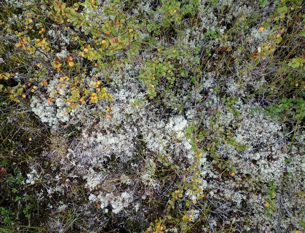 - Травяно-кустарничково-мохово-лишайниковая тундра (рис. 5). ОПП 100%. ПП по группам: кустарнички 70%, травы 25%, мхи 5%, лишайники 60%. Доминанты: Ledum decumbens. Обильные виды: Carex globularis, Betula nana, Vaccinium uliginosum. Прочие виды: Empetrum hermaphroditum, Vaccinium vitis-idaea. Мхи: Dicranum sp. Лишайники: Cladonia stellaris, C. rangiferina, Flavocetraria cucullata, Thamnolia vermicularis, Nephroma sp.