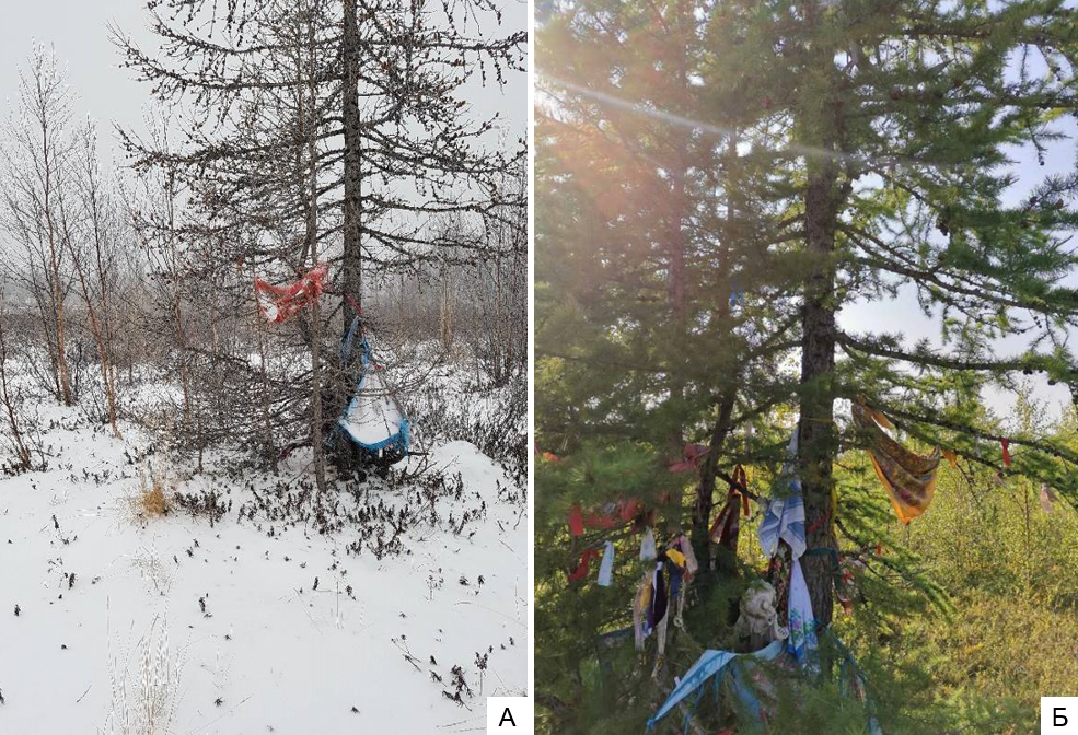 Около центрального объекта священного места – сакральной лиственницы – наблюдается антропогенное нарушение напочвенного покрова (полностью вытоптанные участки) (рис. 3). По всей исследованной территории развита сеть тропинок. Вытаптывание сопровождается нарушением водно-воздушного режима почвы, что находит отражение в обеднённом составе наземного яруса растительности по сравнению с ненарушенными лесотундровыми ландшафтами. Вблизи дорог наблюдаются нарушения целостности растительного покрова автотранспортом – автомобильные колеи, места постоянных стоянок. В 4-х км от священного места расположен аэропорт г. Салехарда. Таким образом, территория священного места «Ангальский мыс» испытывает значительное рекреационное воздействие и влияние фактора беспокойства.