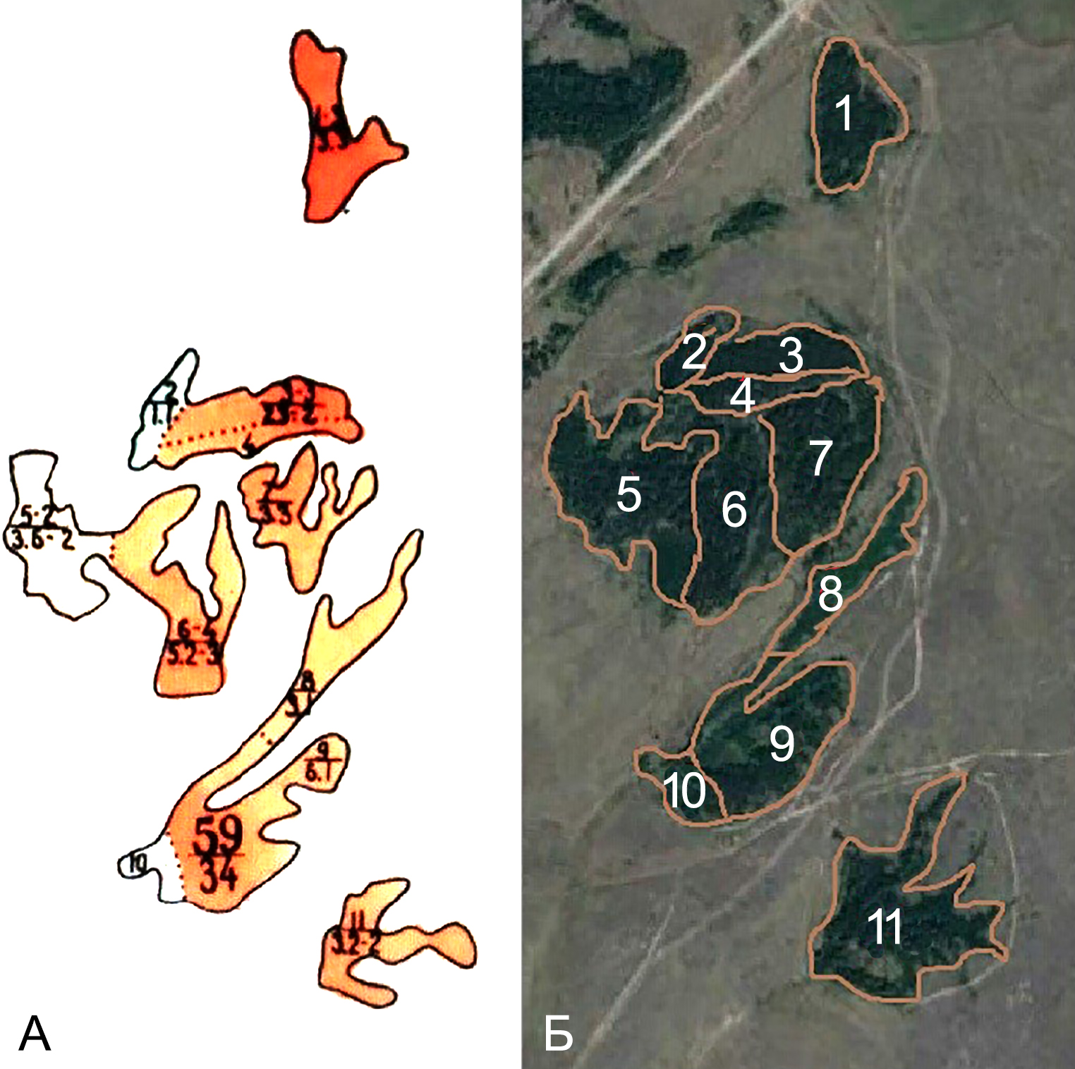Рисунок 1 – Территория памятника природы «Аландский бор» по материалам лесоустройства (А) и текущее состояние (Б) – белыми цифрами показано сопоставление лесохозяйственных выделов по материалам лесоустройства с проведенным геоботаническим обследованием территории