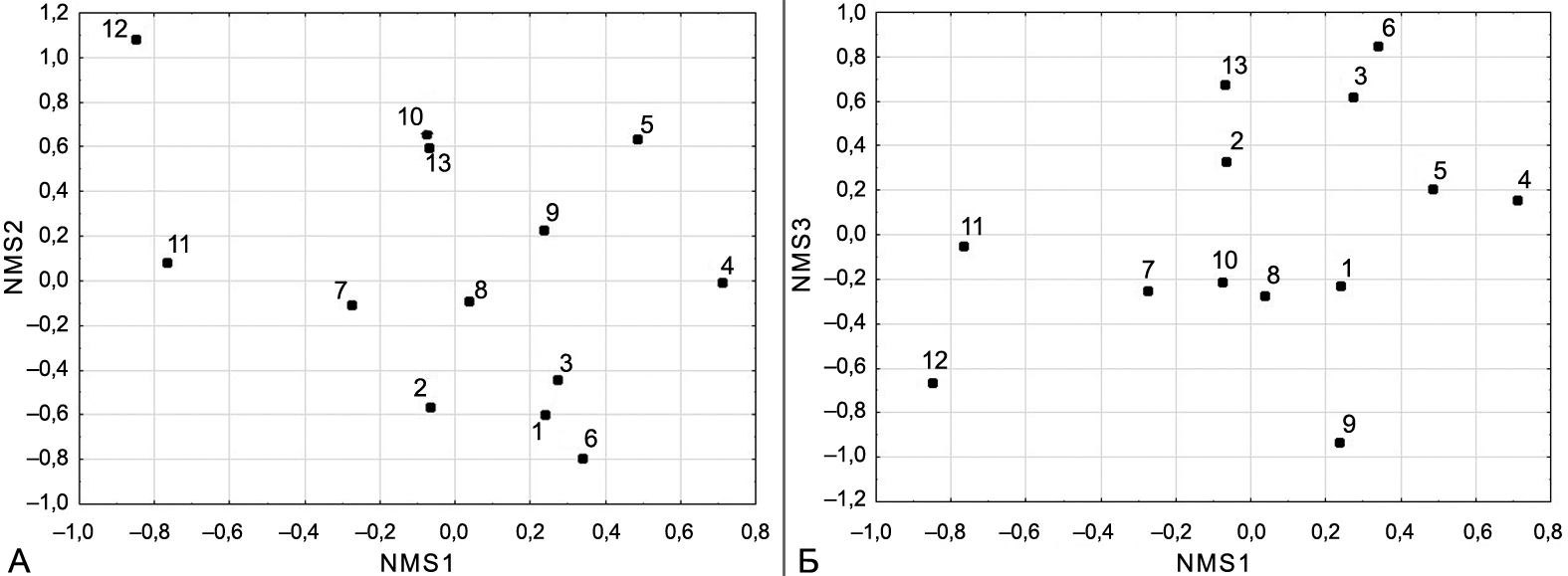 Ценотическая ординация выполнялась в трех осях неметрического многомерного шкалирования (NMS) (рис. 2).