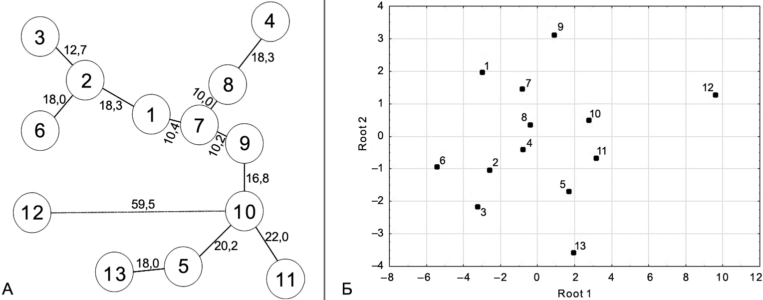 Рисунок 3 – Ординация биотопов ассоциаций сосняков Аландского бора: А – методом максимального корреляционного пути (цифрами указан квадрат расстояния Махаланобиса); Б – в первых осях дискриминантных функций (Root_1, Root_2)