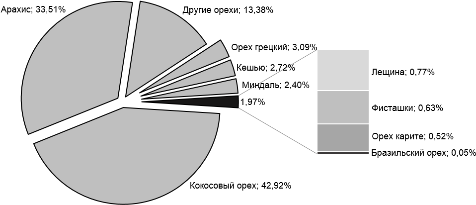 Рисунок 1 – Структура мирового производства орехов в 2019 г. (всего – 145499566 т) (построено авторами по данным статистической базы FAO [5])