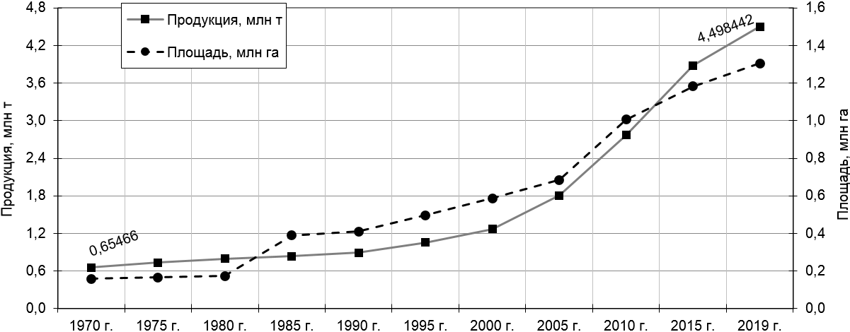 Рисунок 2 – Динамика мировой продукции ореха грецкого за 1970–2019 гг. (построено авторами по данным статистической базы FAO [5]). Примечание. Подписи данных при крайних точках отражают объем плодов ореха грецкого, млн т, в 1970 и 2019 гг. соответственно