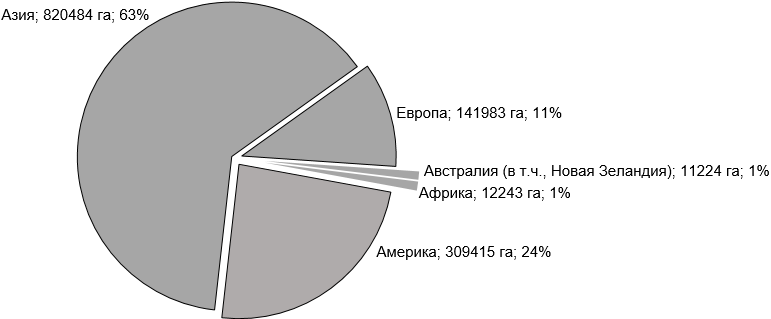 Рисунок 3 – Распределение площадей, занятых культурой ореха грецкого, по частям света в 2019 г. (построено авторами по данным статистической базы FAO [5]). Примечание. Для частей света указаны: площадь насаждений ореха, га; доля от суммарной площади, %