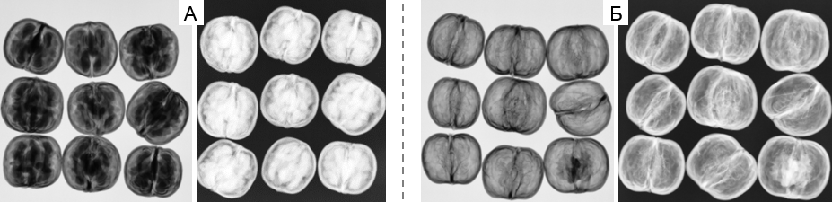 Рисунок 5 – Примеры рентгеноскопических изображений ореха грецкого: А – семена с полноценно развитым ядром, Б – семена с практическим отсутствием либо недоразвитием ядра. Примечание. В каждой паре изображений первое – позитив, второе – негатив