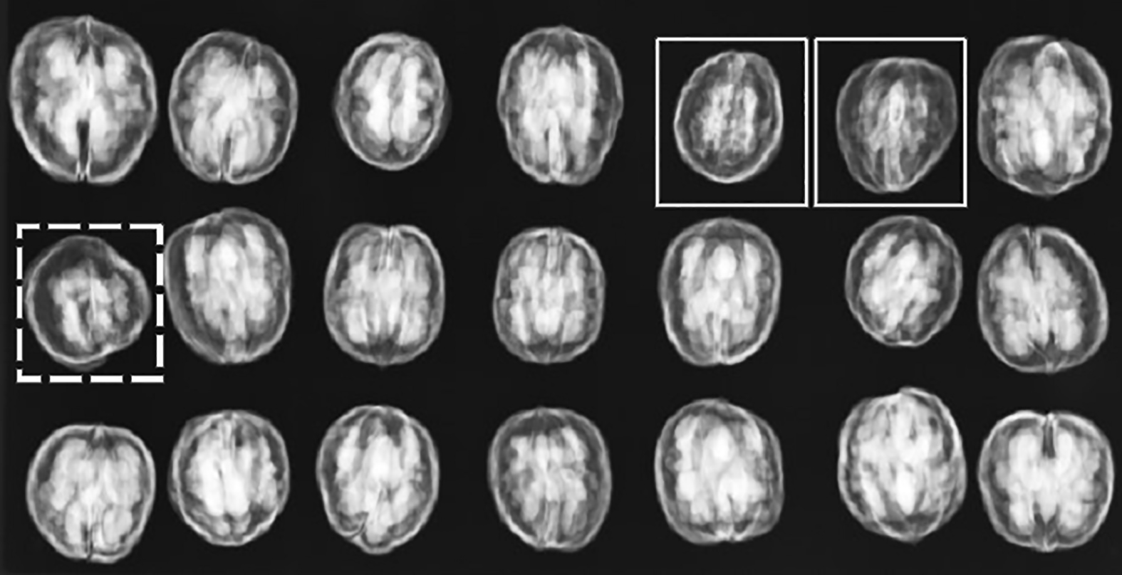 Предварительное рентгеноскопическое изучение семян ореха грецкого для группы тестовых проб урожая 2021 года, полученных от различных экземпляров деревьев из коллекции ботанического сада Самарского университета, дало обнадеживающие результаты как в плане неповреждающей экспресс-оценки качества орехов, так и для их ускоренной «сортировки». Хорошо известно, что визуальная оценка орехов не всегда позволяет выявить их несформированность, а вскрытие скорлупы для осмотра ядра делает семя непригодным для будущего посева либо закладки в семенной банк. Рентгеноскопический снимок семян ореха грецкого достаточно хорошо визуализирует внутреннюю структуру каждого семени и позволяет быстро проанализировать качество выборки в целом. При размещении орехов на планшетах с маркированными ячейками в соответствии с полученным рентгеноскопическим снимком мы смогли в считанные секунды отбраковать некачественные диаспоры и в дальнейшем работать только с полноценным материалом.