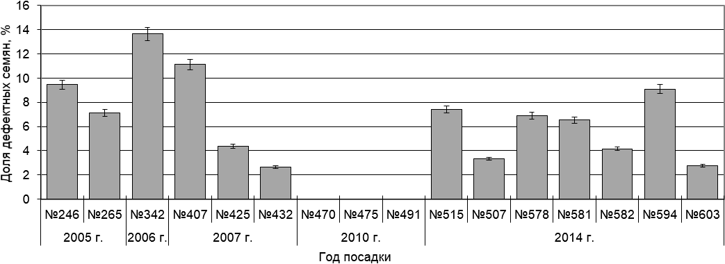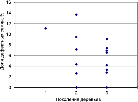 Доля дефектных семян в урожае деревьев, относящихся к разным поколениям (рис. 9), показала наибольшую изменчивость показателя для деревьев второго поколения (выращены из семян, полученных от деревьев 1 поколения собственной генерации). По сравнению с ними деревья следующего поколения (их дети) сформировали семена, среди которых доля дефектных не превышала 10%.