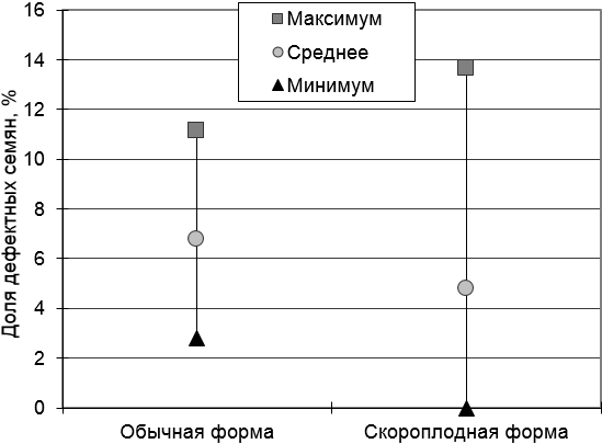 По принадлежности деревьев, сформировавших семена, к обычной либо скороплодной формам семеношения (рис. 8) можно заметить, что средний показатель доли дефектных семян для скороплодной формы был ниже, что сочеталось с более выраженной изменчивостью показателя.