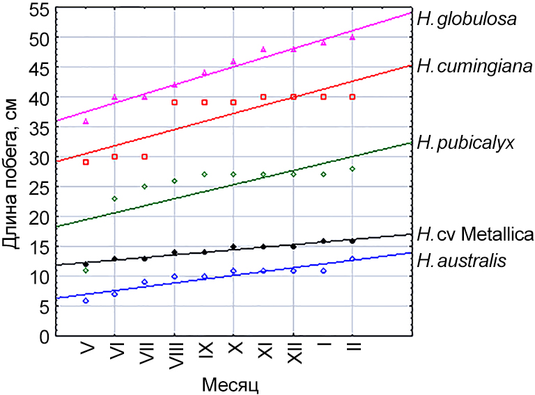 Для большинства исследованных видов Hoya в условиях интерьера отмечен замедленный рост побегов и прирост листьев в течение всего вегетационного периода, с максимальным развитием в весенне-летний период. Интенсивный и равномерный рост на протяжении всего периода наблюдения характерен для H. globulosa, H. cumingiana и H. pubicalyx (рис. 1).