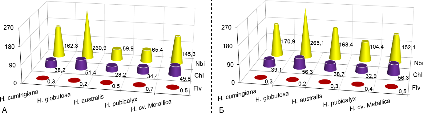 Рисунок 2 – Сравнительный анализ средних значений показателей (Nbi, Chl, Flv) в листьях оранжерейных растений рода Hoya (А – июль; Б – сентябрь)