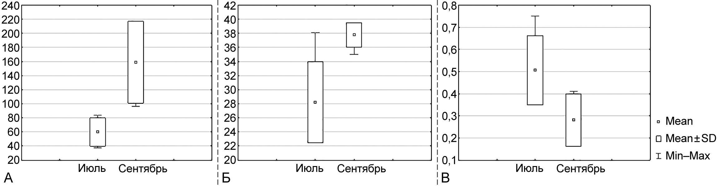 В полученных результатах статистически значимыми были различия при сравнении зависимых выборок показателей Nbi, Chl, Flv в листьях H. australis за месяцы (июль, сентябрь), при значении p < 0,05 (рис. 3). Это свидетельствует об активном росте растений летом и переходе их к состоянию покоя в сентябре.