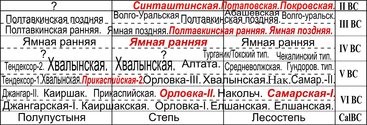 Примечание. Курсивом выделены культуры с установленным профилем ДНК лошадей. Синташтинская, потаповская и покровская культуры с профилем ДНК лошадей DOM-2