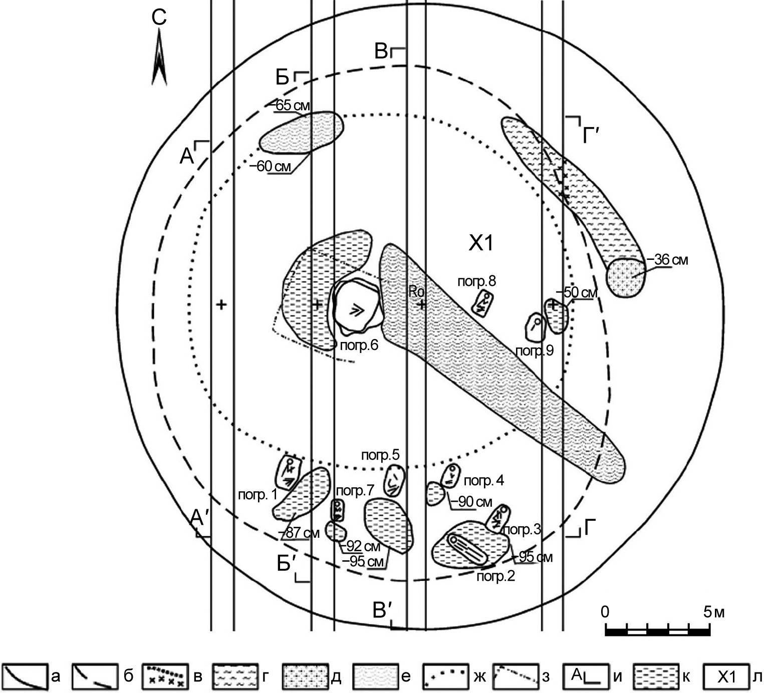 Рисунок 2 – Курганный могильник Масленниково I. Курган 1. План. Условные обозначения: а – современная граница насыпи кургана; б – граница досыпки кургана; в – прокаленные участки почвы, угли, обугленное дерево; г – золистая почва в пределах современного рва; д – прокаленная почва; е – заполнение современной траншеи; ж – граница первоначальной насыпи кургана; з – граница участка со снятым гумусным слоем; и – линии снятия профилей (А–А′, Б–Б′, В–В′, Г–Г′); к – могильный выкид; л – череп животного (−35 см от 0)