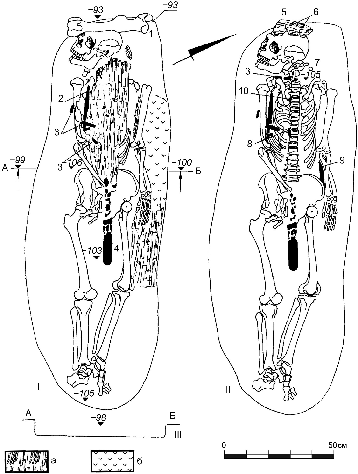 Рисунок 3 – Курганный могильник Масленниково I. Курган 1. План погребения 2: I – до снятия древесного тлена и прослойки угля, II – после снятия древесного тлена и прослойки угля, III – разрез могильной ямы по линии А–Б (значения глубин – в см). Условные обозначения: а – дерево; б – угли; 1 – кость ноги лошади; 2 – железный предмет; 3 – фрагменты обкладок из светлого металла; 4 – обкладки ножен (?) из светлого металла; 5 – фрагменты деревянного предмета; 6 – фрагменты золотой фольги; 7 – золотая серьга; 8, 9 – железные предметы; 10 – кремешок