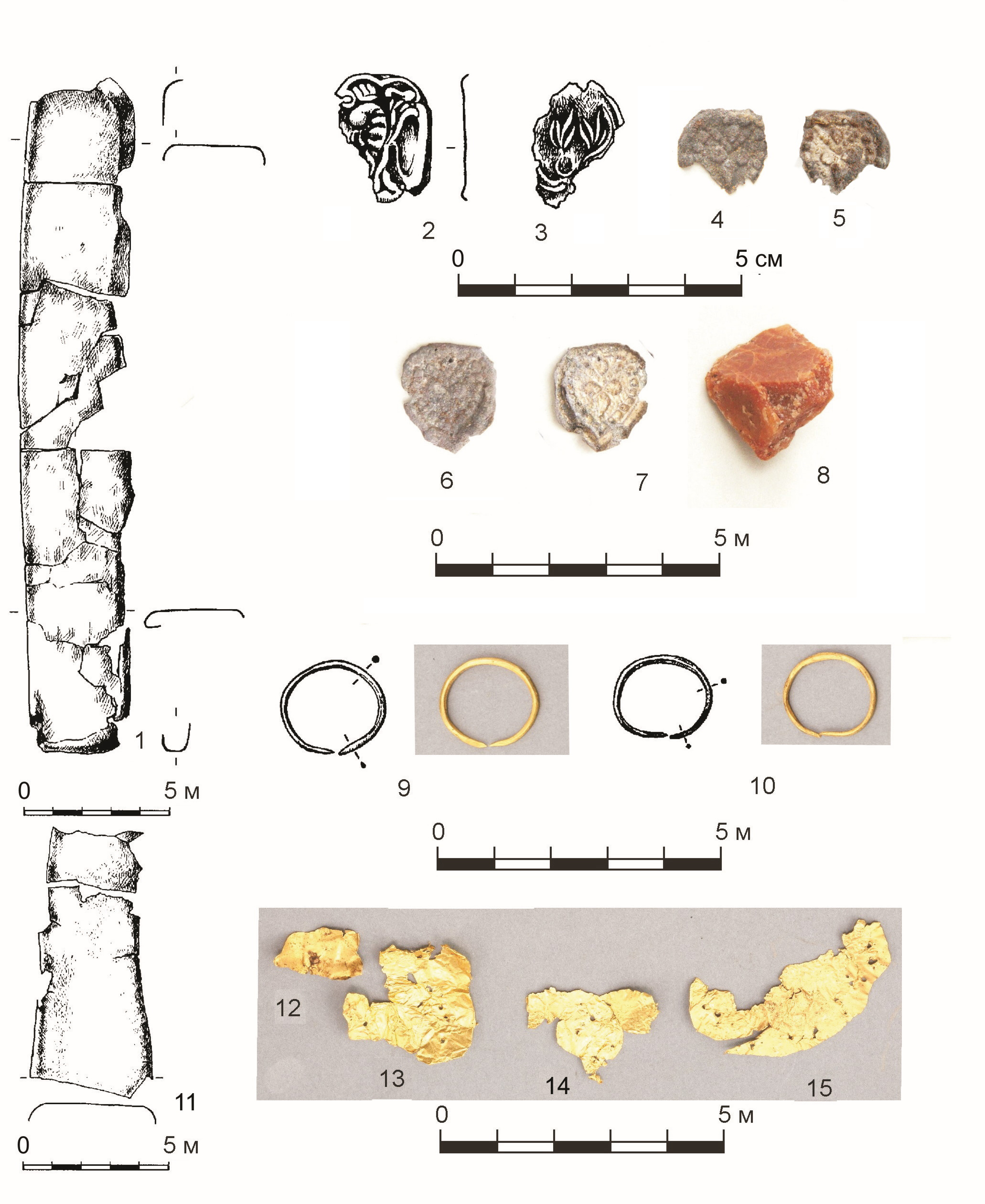 Рисунок 4 – Курганный могильник Масленниково I. Курган 1. Вещи из погребения 2: 1, 11 – обкладка ножен (?) из светлого металла; 2–7 – серебряные бляшки (2 – бляшка 1; 3 – бляшка 2; 4, 5 – бляшка 3; 6, 7 – бляшка 4); 8 – кремешок; 9, 10 – золотые серьги; 12–15 – фрагменты золотой фольги