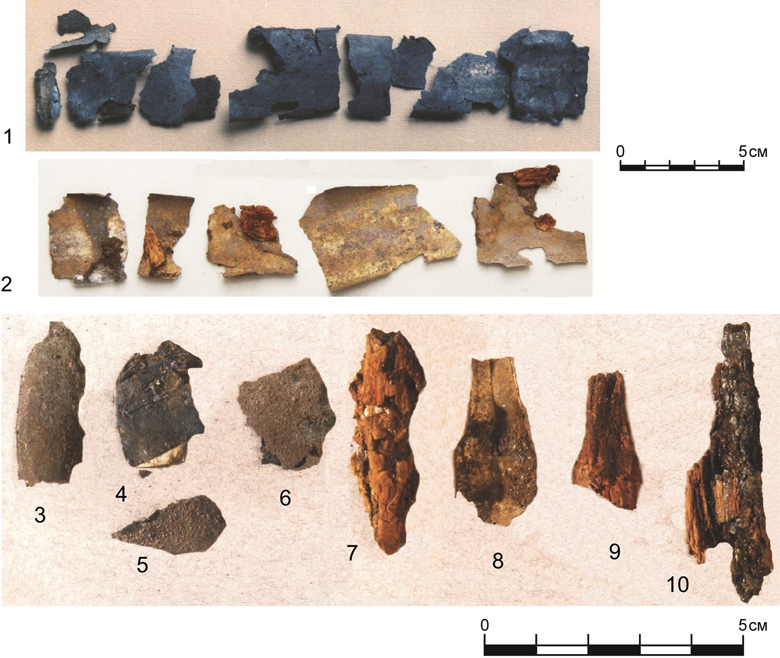 Рисунок 5 – Курганный могильник Масленниково I. Курган 1. Вещи из погребения 2: 1 – внешняя сторона обкладки ножен (?) из светлого металла; 2 – внутренняя сторона крупных фрагментов обкладки ножен (?) из светлого металла с фрагментами дерева; 3–6 – фрагменты обкладок под древесным тленом; 7, 9, 10 – фрагменты железных предметов; 8 – фрагмент металлической обкладки железного предмета под номером 9