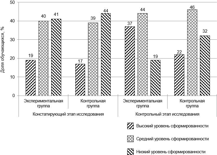 Анализ интегрированной оценки совокупности сформированности всех компонентов смыслового чтения показывает, что в основном обучающиеся имеют средний уровень – 44% в экспериментальном классе (на констатирующем этапе 40%), 46% в контрольном (на констатирующем этапе 39%), а процент обучающихся с высоким уровнем сформированности компонентов смыслового чтения в экспериментальном классе составил 37%, что на 18% больше, чем на констатирующем этапе, в контрольном 22%, что на 5% больше, чем на констатирующем этапе. Уменьшилось и число обучаемых с низким уровнем сформированности компонентов смыслового чтения: в экспериментальном классе на 22% (на констатирующем этапе 41%, на контрольном 19%), в контрольном классе уменьшение составило 12% (на констатирующем этапе 44%, на контрольном 32%). Если количество обучающихся со средним уровнем сформированности всех компонентов не имеет резких отличий, то на высоком и низком уровнях они наблюдаются. В контрольном классе изменения незначительные, особенно при сравнении показателей с высоким и низким уровнем сформированности компонентов смыслового чтения. Нужно отметить, что в экспериментальном классе обучаются только девочки, а в контрольном классе только мальчики, и наблюдение в течение экспериментальной работы показало, что девочки более усидчивы, старательны, аккуратны. Динамика сформированности компонентов смыслового чтения учащихся контрольного и экспериментального классов до и после проведения формирующего этапа эксперимента представлена на рис. 1.