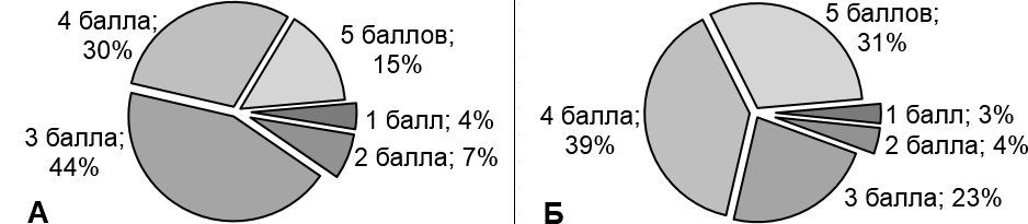 Рисунок 1 – Контрольная оценка дистанционного обучения студентами (А – до проведения программы; Б – после проведения программы)