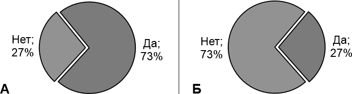 Рисунок 2 – Распределение ответов на вопрос «Возникли ли у вас проблемы в связи с переходом на дистанционный формат обучения?» (А – до проведения программы; Б – после проведения программы)