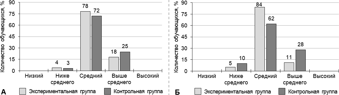 Рисунок 1 – Гистограмма распределения уровней сформированности компетенции самоорганизации и самообразования в ЭГ и КГ наборов 2018 г. (А) и 2020 г. (Б) на констатирующем этапе