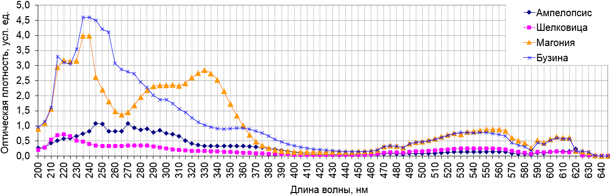 Как следует из представленного графика, экстракт из плодов Sambucus nigra, среди изученных нами растений, количественно показывает наиболее высокое содержание компонентов, соответствующих данному пику (230–240 нм). Что касается Mahonia aquifolium, ее спектрограмма демонстрирует наличие двух значительных по площади пиков в диапазоне 210–360 нм. Первый из них, соответствующий 230–240 нм, несколько ниже по высоте (оптической плотности) соответствующего пика на спектрограмме экстракта бузины. Второй пик, в области поглощения 320–340 нм, демонстрирует максимальный среди всех объектов уровень оптической плотности в данной части спектра. Данному объекту свойственна также максимальная по сравнению с другими образцами оптическая плотность в спектральной области 300–350 нм.