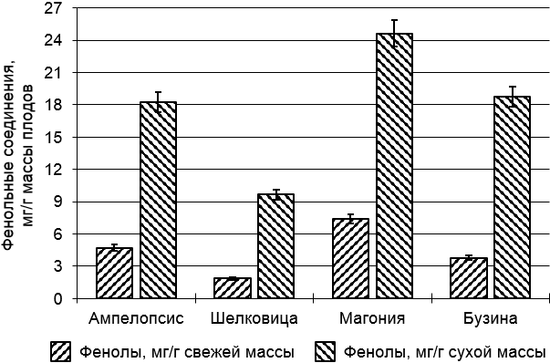 Ориентировочная оценка сумма фенольных соединений в исследуемых экстрактах показала, что объекты различаются по количеству извлекаемых фенольных соединений. Наибольшее количество фенольных соединений выявлено у магонии и в свежей и сухой массе (7,41 и 24,62 мг/г соответственно), на втором месте по содержанию исследуемых веществ – ампелопсис и бузина (скорее всего, это указывает на то, что у этих растений плоды разной оводненности). И наименьшее количество фенольных соединений обнаружено в плодах шелковицы (рис. 6).