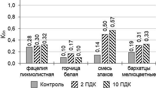 Для высоких концентраций ионов меди лучшим фитоаккумулятором является смесь злаковых трав. При увеличении концентрации ионов меди в почве до 2 ПДК относительно контроля, содержание этого тяжелого металла в растительном материале увеличивается в 3,6 раза, а при увеличении концентрации в почве до 10 ПДК – более чем в 4 раза. Значения коэффициента биологического поглощения (Кбп) при этом фиксируется на уровне 0,50 и 0,57 соответственно.
