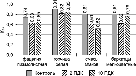 Анализ значений коэффициентов аккумуляции исследуемых культур показал, что при низком (фоновом) содержании ионов меди в почве значимое снижение её концентрации выявляется только на варианте с фацелией пижмолистной, что подтверждается самым низким значением коэффициента аккумуляции (Как = 0,74). При содержании ионов меди в почве в концентрациях 2 ПДК значимое её снижение обнаруживается на вариантах со злаковой смесью и бархатцами мелкоцветными, что подтверждается соответствующими значениями Как (0,61 и 0,62). При содержании ионов меди в почве в концентрациях 10 ПДК значимое её снижение обнаруживается на варианте со злаковой смесью (Как= 0,52).