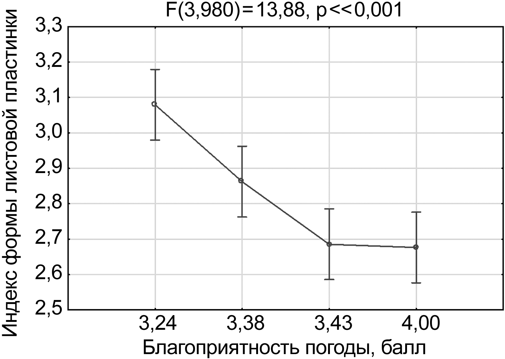 В ходе однофакторного дисперсионного анализа, в котором в качестве действующих на исследуемый признак факторов выступала степень благоприятности погоды, установлено высоко значимое влияние исследуемого фактора на ИФ (рис. 1). При ухудшении погодных условий происходит увеличение ИФ, следовательно, вытягивание верхушки листовой пластинки.